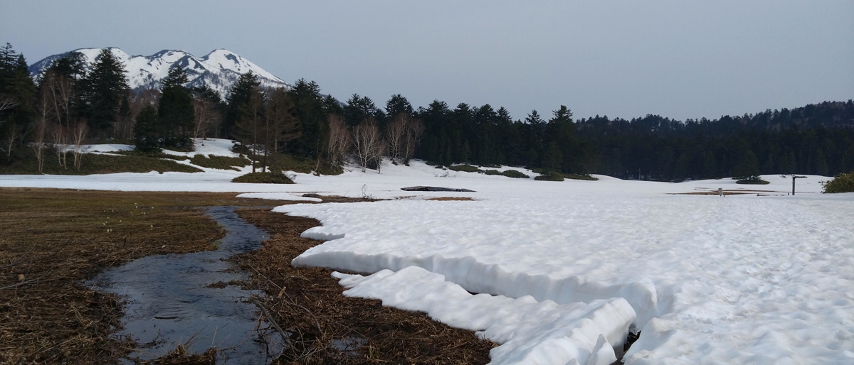 このように尾瀬沼周辺は、まだ残雪が多くありますので、おいでになる際には、チェーンスパイク等の雪山歩きができる装備で、安全第一でおいでください。