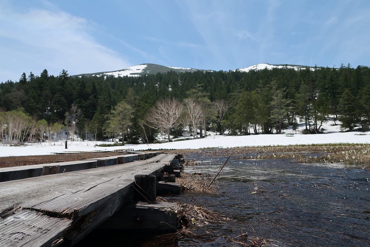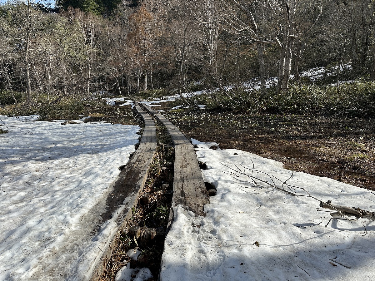 鳩待峠~山ノ鼻間の木道は所々残雪があります。念のためにすべり止めを携帯し、すべりにくい靴でお越しください。