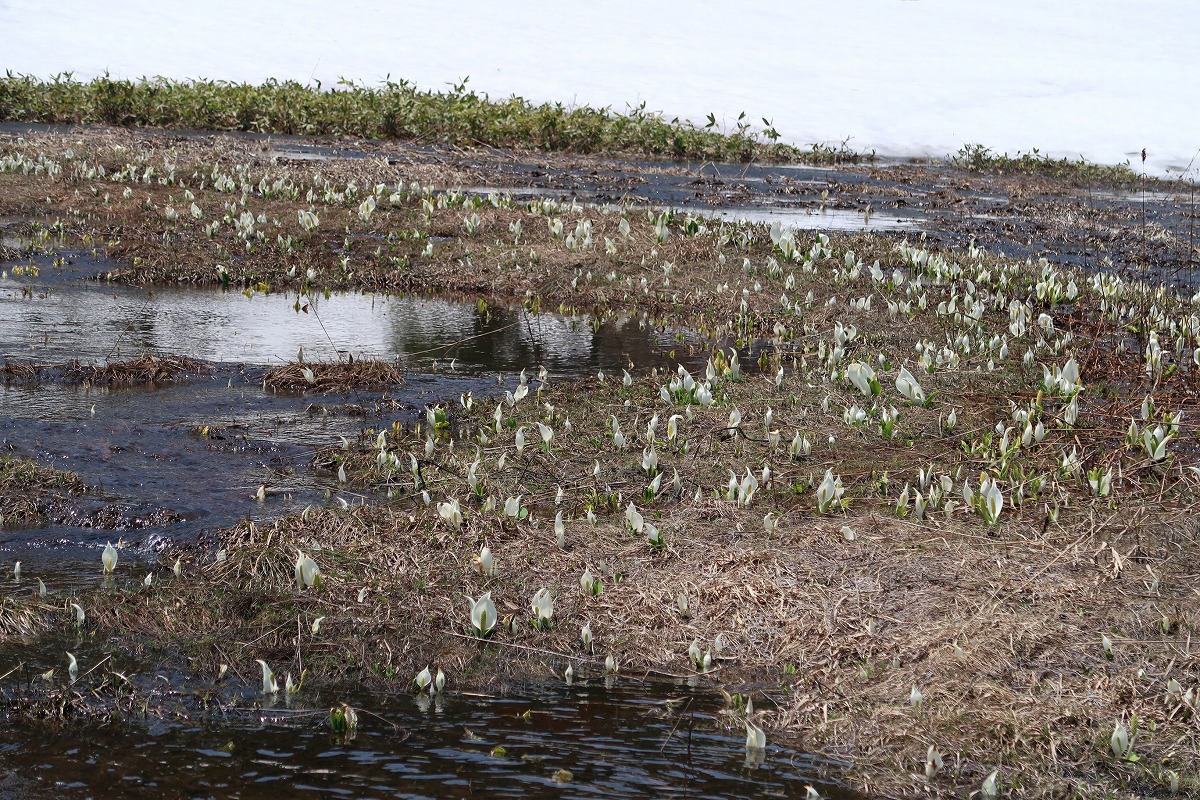 小さめなミズバショウの群落。雪解け水にただよいながら可愛い姿が見られました。