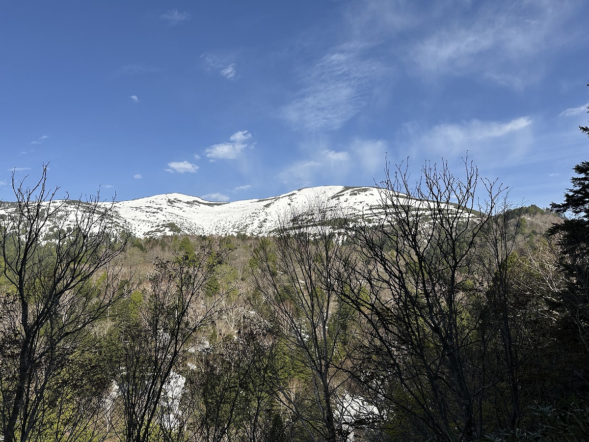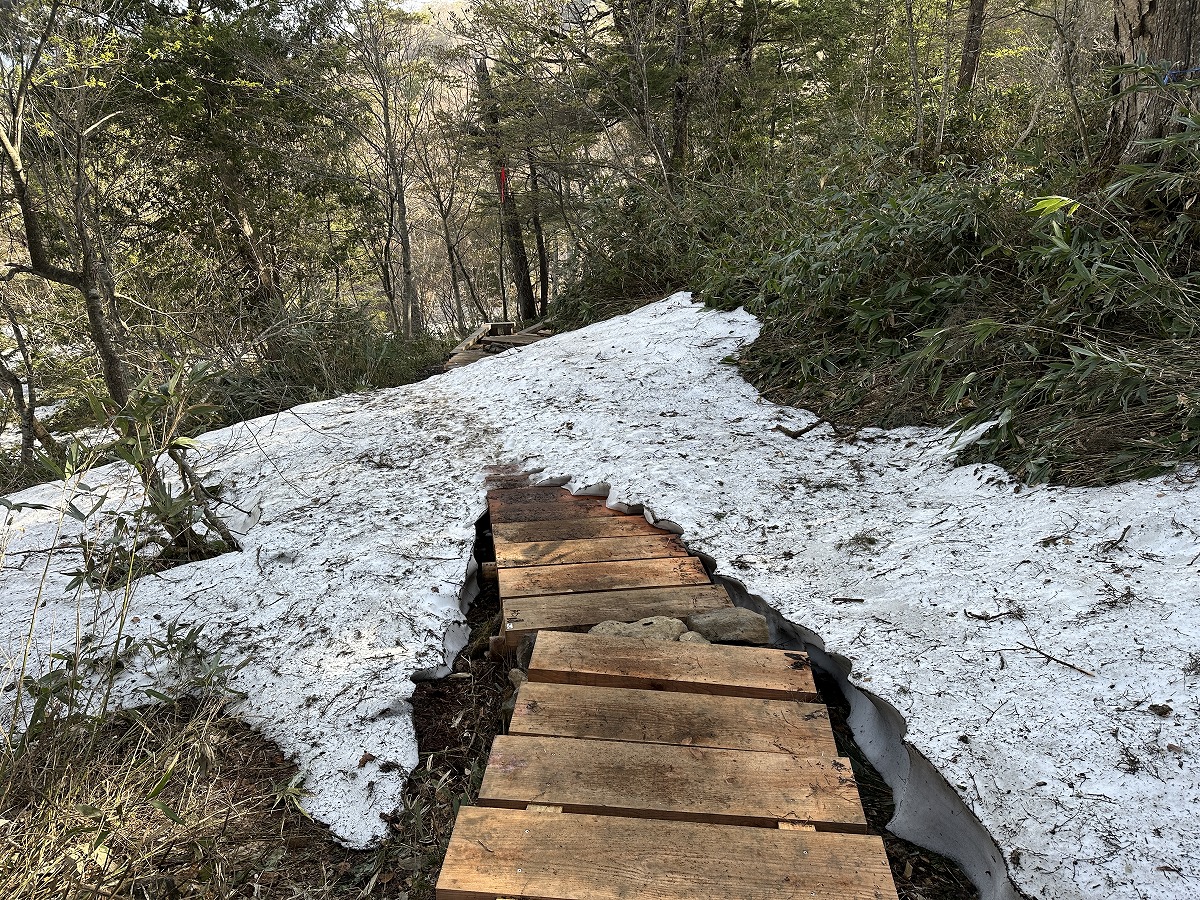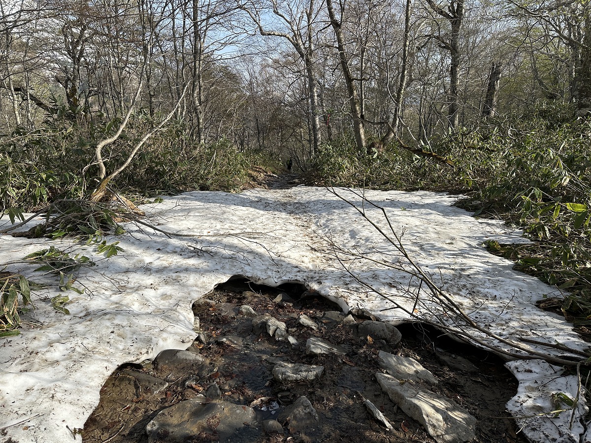 石畳の登山道には新緑が芽吹き始め残雪の登山道を歩きます。融雪水で川状になっている箇所もありますのでご注意ください。