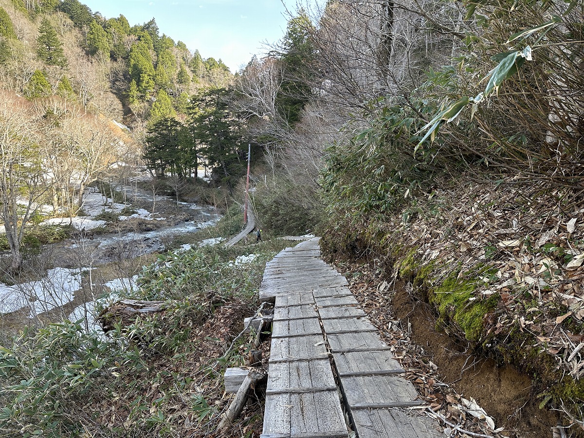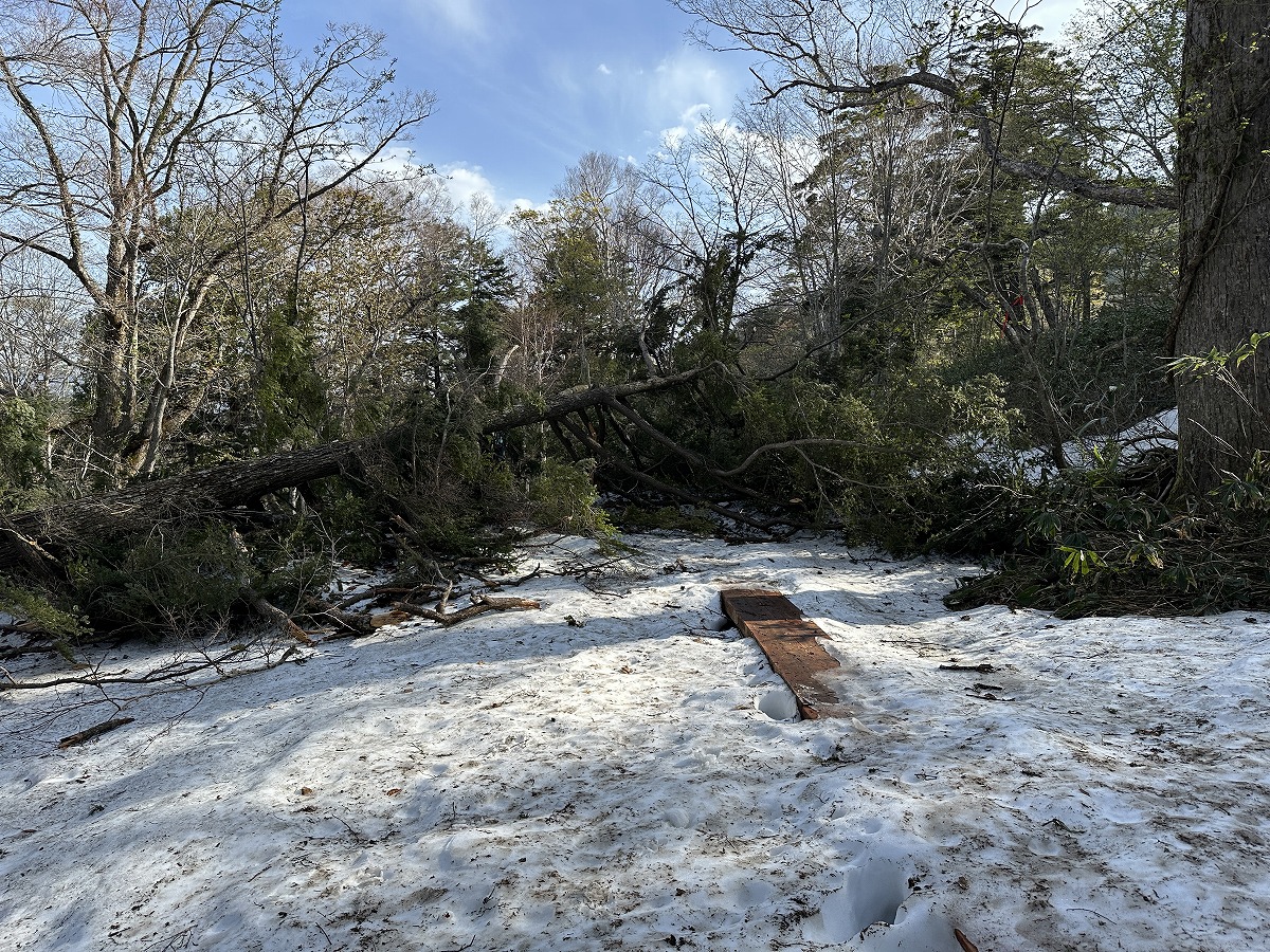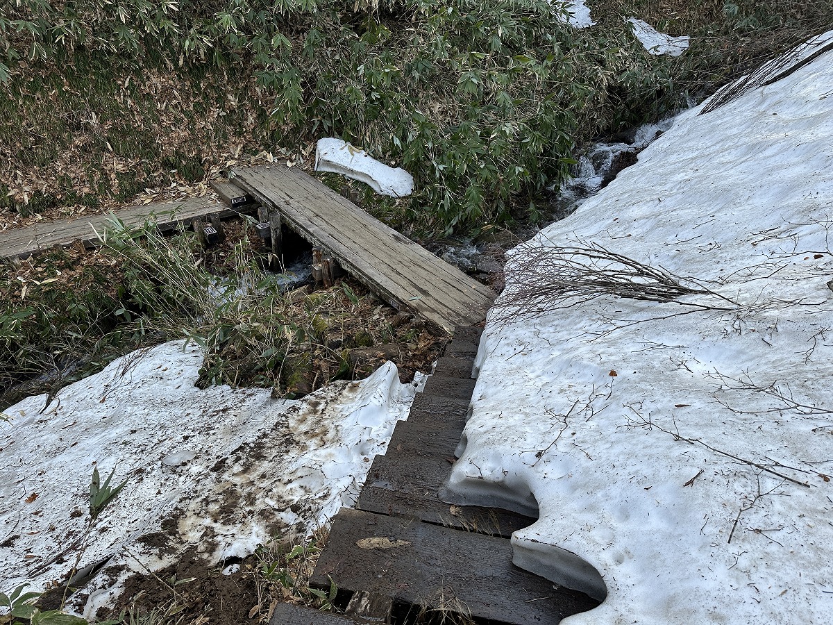 木道が出始めている所の段差や木道脇の踏み抜きには注意しましょう。木道と木道の間などは、表面は雪に覆われていますが下が空洞になっていて、不用意に乗ると踏み抜いてしまいます。ズボッと足が沈んで歩きにくく、思わぬ怪我につながるので慎重に歩く必要があります。
