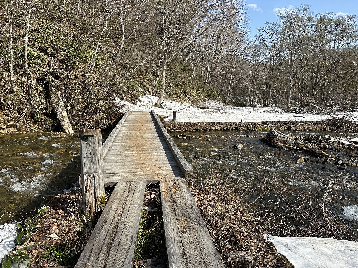 もう少しで山の鼻ビジターセンターに到着です。橋をわたると大きなベンチがあるのですが雪が解けるまでもう少しおまちください。