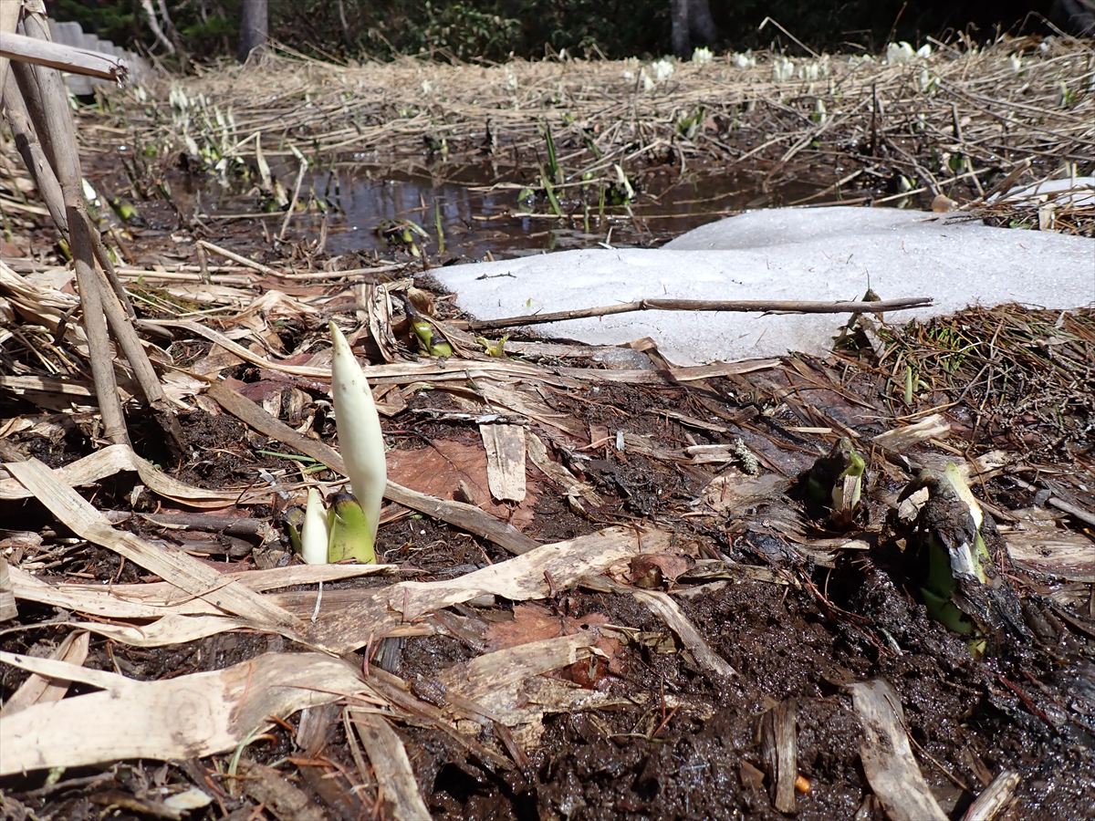 ミズバショウも咲き始めましたが、まだまだこれからの芽もたくさんあります。上の写真では、頭が少しだけ出ているミズバショウがたくさん見られます。