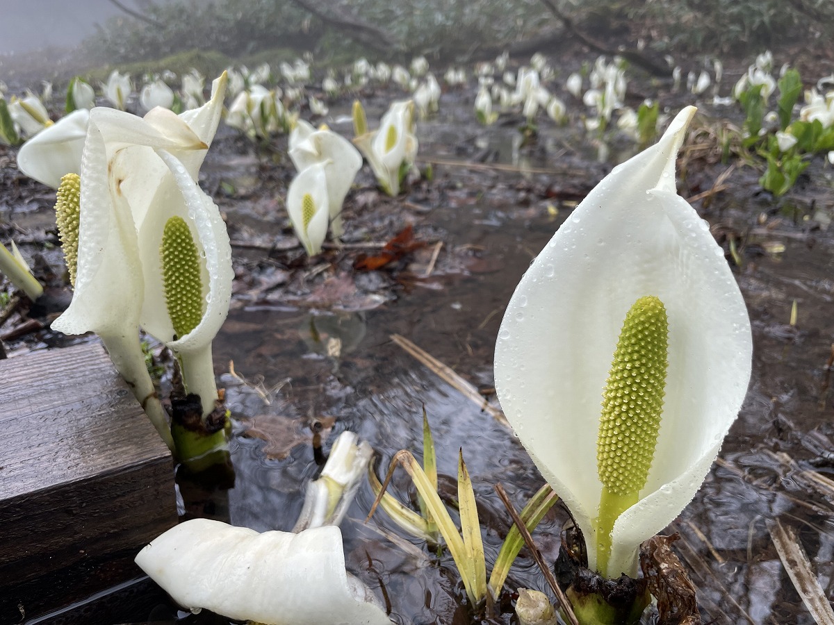 鳩待峠~山ノ鼻間にあるテンマ沢湿原では、日に日にミズバショウの数が増えてきました。