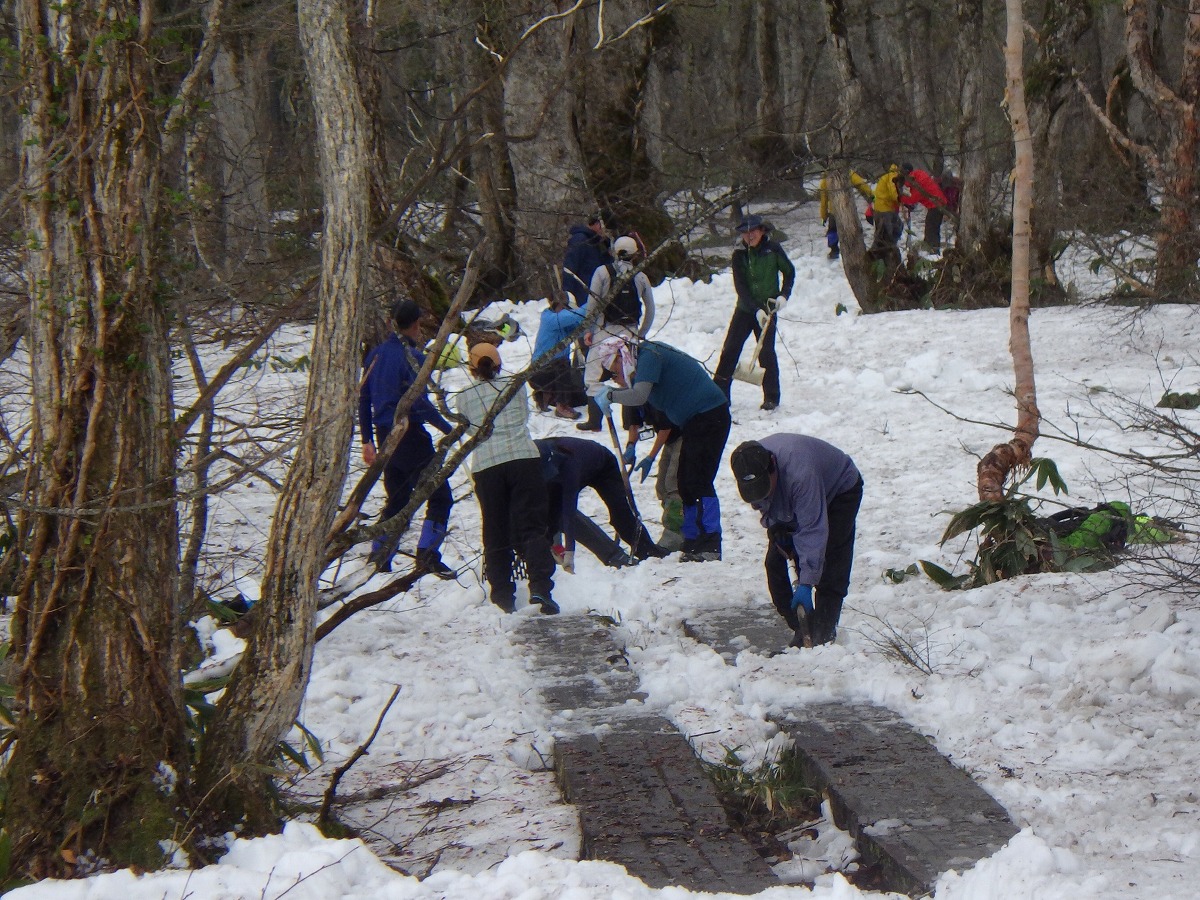 鳩待峠~山ノ鼻間は約9割程度木道が出ていますが、日陰では残雪が多くまだ木道が見えていません。写真は、山の鼻ビジターセンター手前の様子です。本日、尾瀬ガイド協会の皆さんが除雪をしてくださいましたが、念のためにすべり止めを携帯し、すべりにくい靴でお越しください。