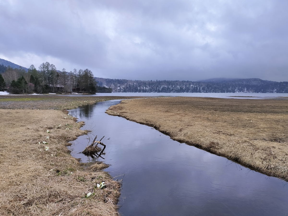 大江湿原は、すっかり雪が消えて、大江川は、雪解け水で川幅がかなり広くなっています。