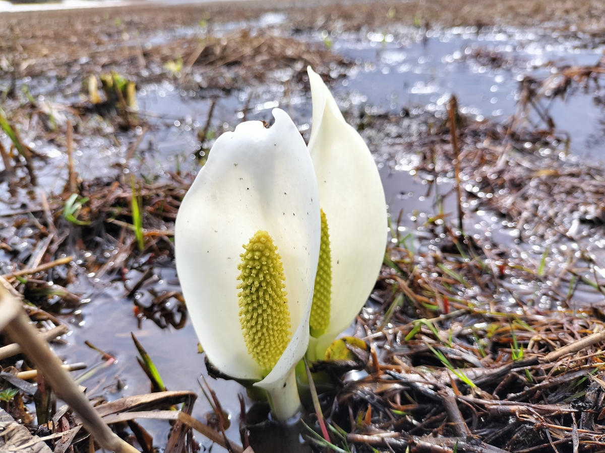湿原のあちらこちらで、小さなミズバショウがたくさん咲き始めています。