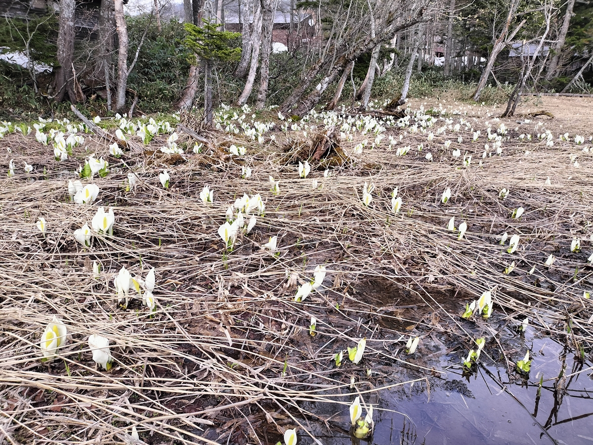 釜ッ堀湿原のほうは、まだ雪が残っていますが、雪が消えたところでは、たくさんのミズバショウが咲き始めています。