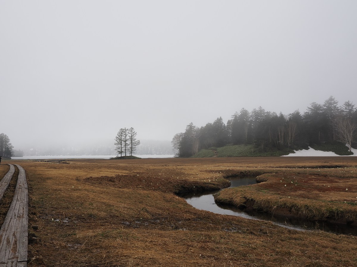 「曇りのち雨」とあいにくの天気で燧ヶ岳の姿は見えませんが、そこかしこで見え始めたミズバショウや、幻想的な尾瀬沼の風景に足を止めて写真を撮られているお客様など賑わい始めた尾瀬沼周辺です。