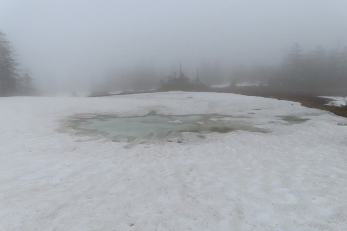 晴天時には燧ヶ岳が望める池塘も本日は霧の中です。