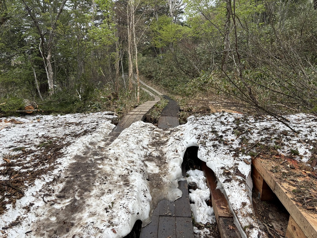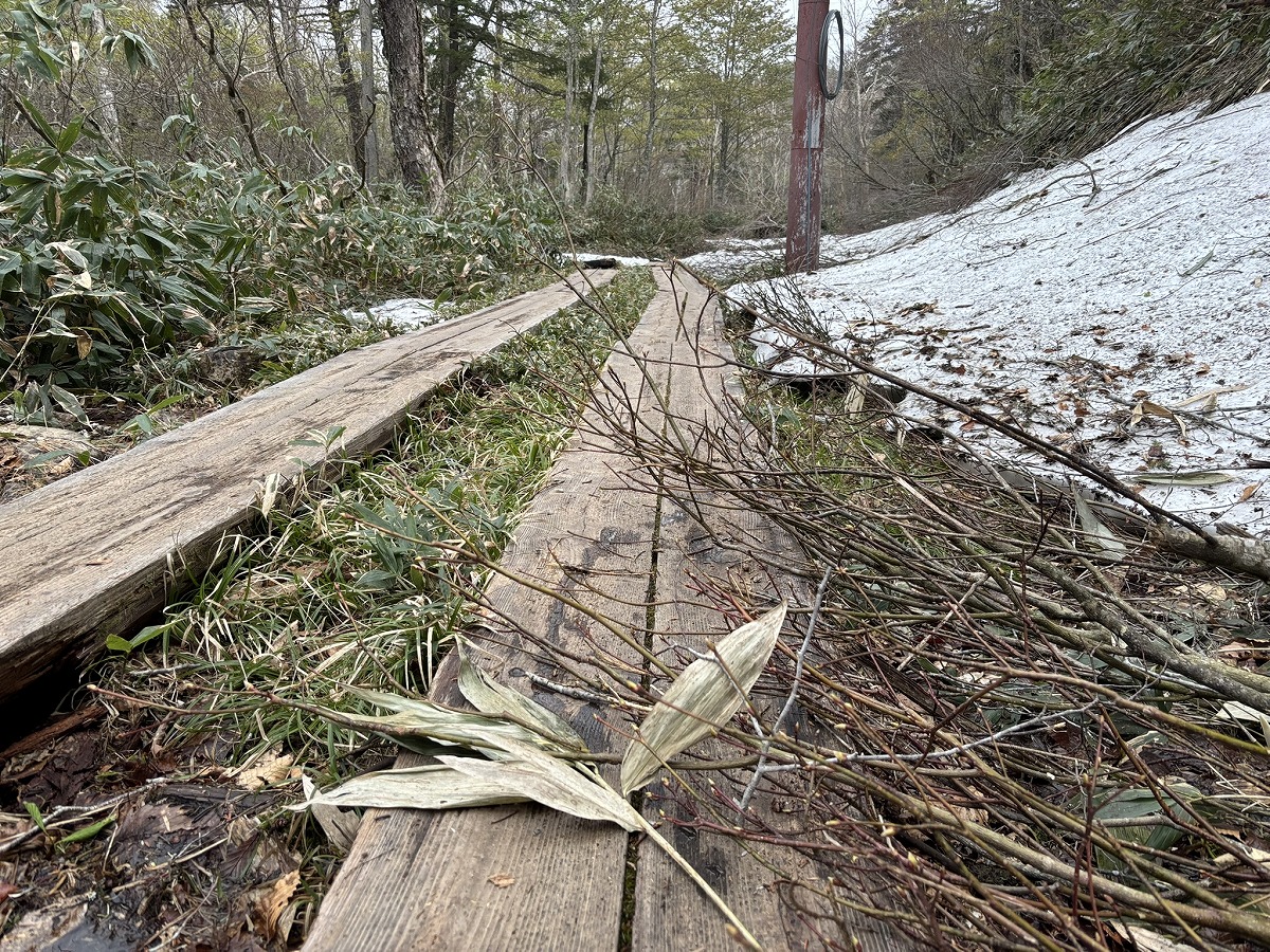 鳩待峠~山ノ鼻間の残雪はほとんどありませんが、左の写真のような場所がまだ2,3ヶ所あります。また、右の写真のように木道に木が倒れ掛かっている場所もあります。木を跨いだり隣の木道に移ったりする際には、滑らないようご注意ください。