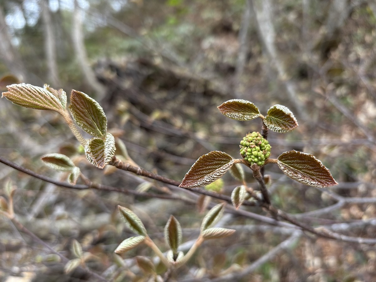 アジサイに似た白い花を咲かせるオオカメノキ。その芽が開き、可愛らしいつぼみが顔を出していました。