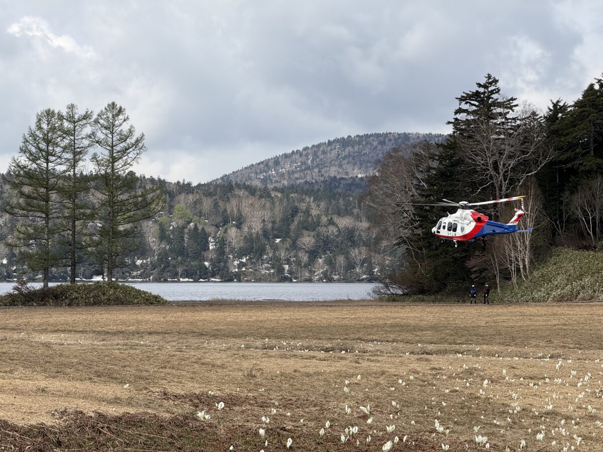 【尾瀬沼に福島県消防防災航空隊の出動の様子】
