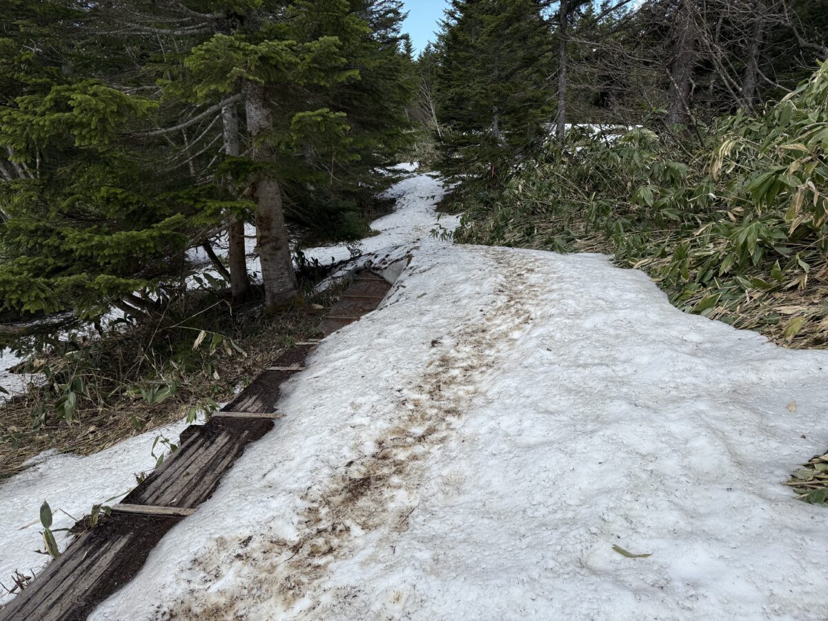 日々、融雪が進んでいます。木道が出てきた付近は踏み抜きの危険があるのでお気を付けください。雪の中に穴が開いている周辺は崩れやすいので慎重に進みましょう。