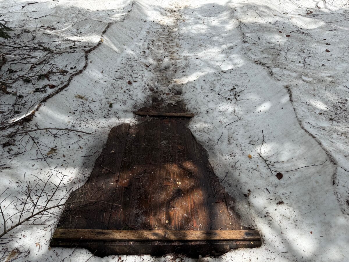 大江湿原の雪は、すっかりとけましたが林内には、まだまだたくさんの雪が残っています。沼山峠入山口から大江湿原入り口までの様子をご覧下さい。昨日の画像になります。入り口の階段を上ると、すぐ雪道になります。少し現れた木道は大変滑りますのでお気を付けください。