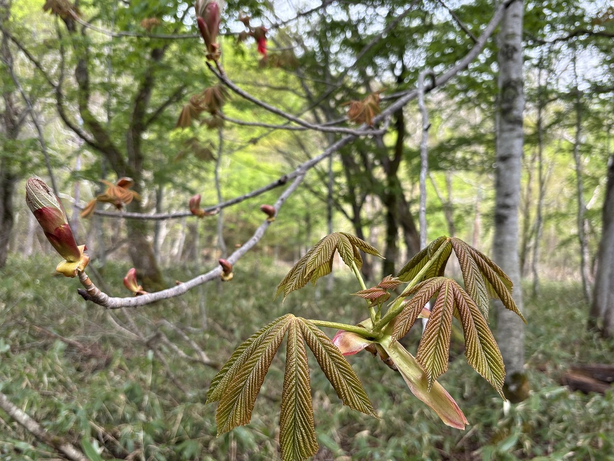 トチノキの葉が開き始めていました。芽も、開き始めたばかりの葉も、他の木々に比べてとても大きいです。