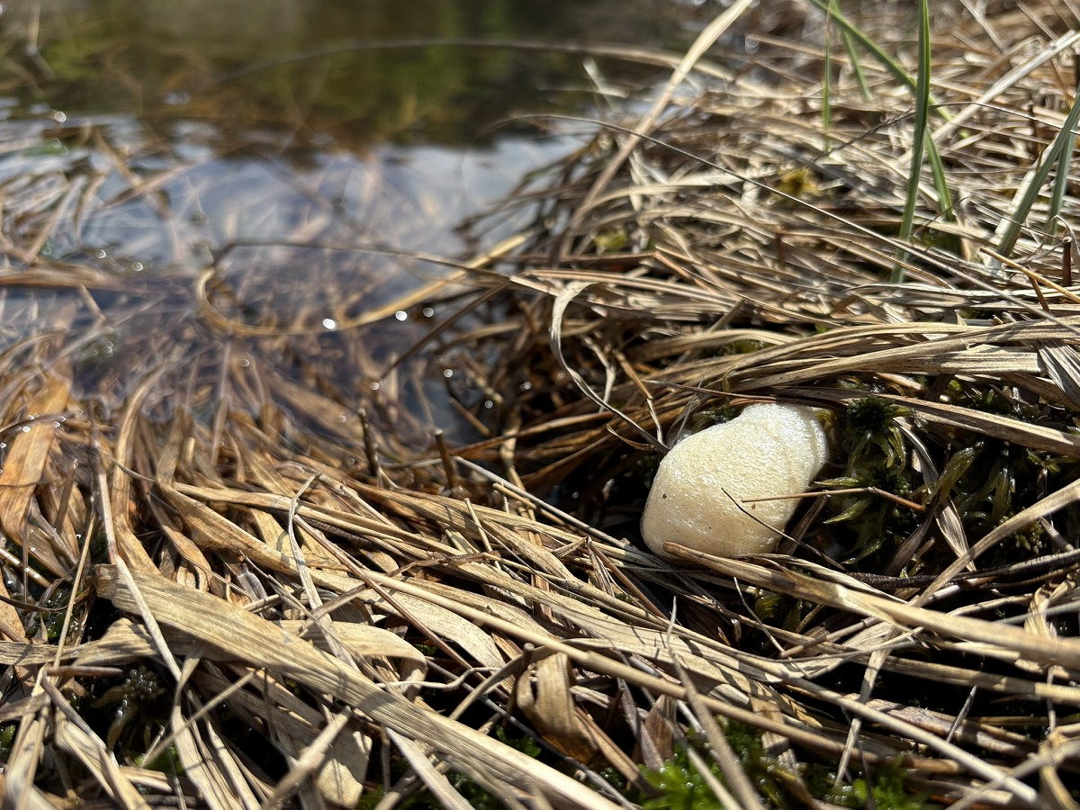 研究見本園の池塘の周りに白い泡に包まれた卵がありました。木の枝先に卵を産むことで知られるモリアオガエルですが、尾瀬ヶ原では池塘のすぐ近くで卵が見られます。