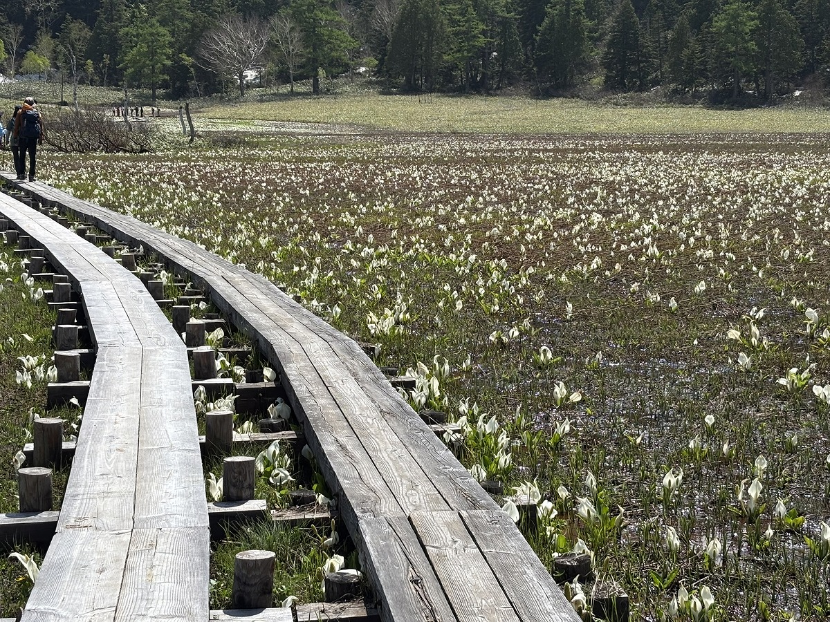 ミズバショウがたくさん咲いています。木道の近くはもちろん、遠くの方まで点描画のように続いています。ミズバショウの群生を見に、ぜひいらしてください。