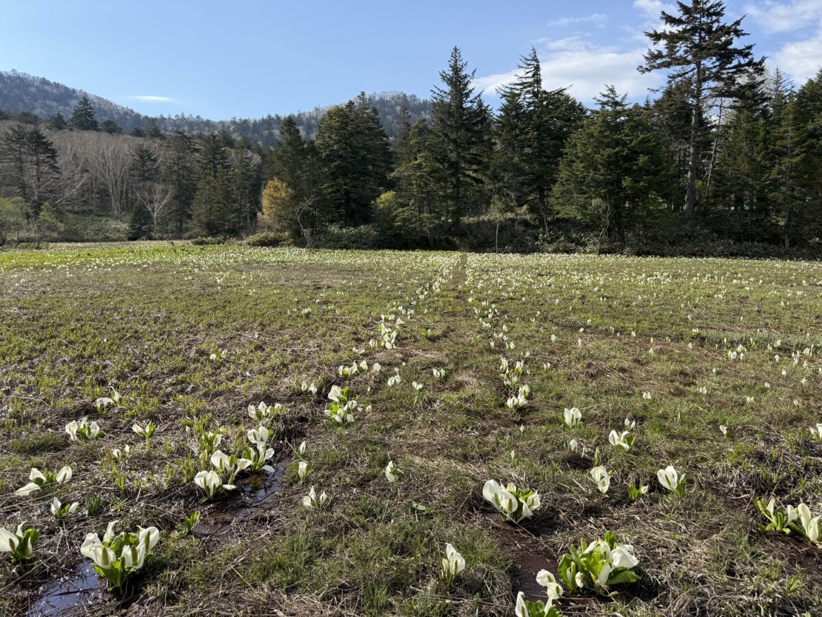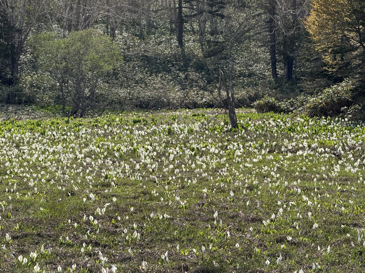 「こんな美しいミズバショウの群生は見たことがない」とハイカーさんの歓声が聞こえてきました。春の妖精ミズバショウの白い絨毯がどこまでも広がっていました。