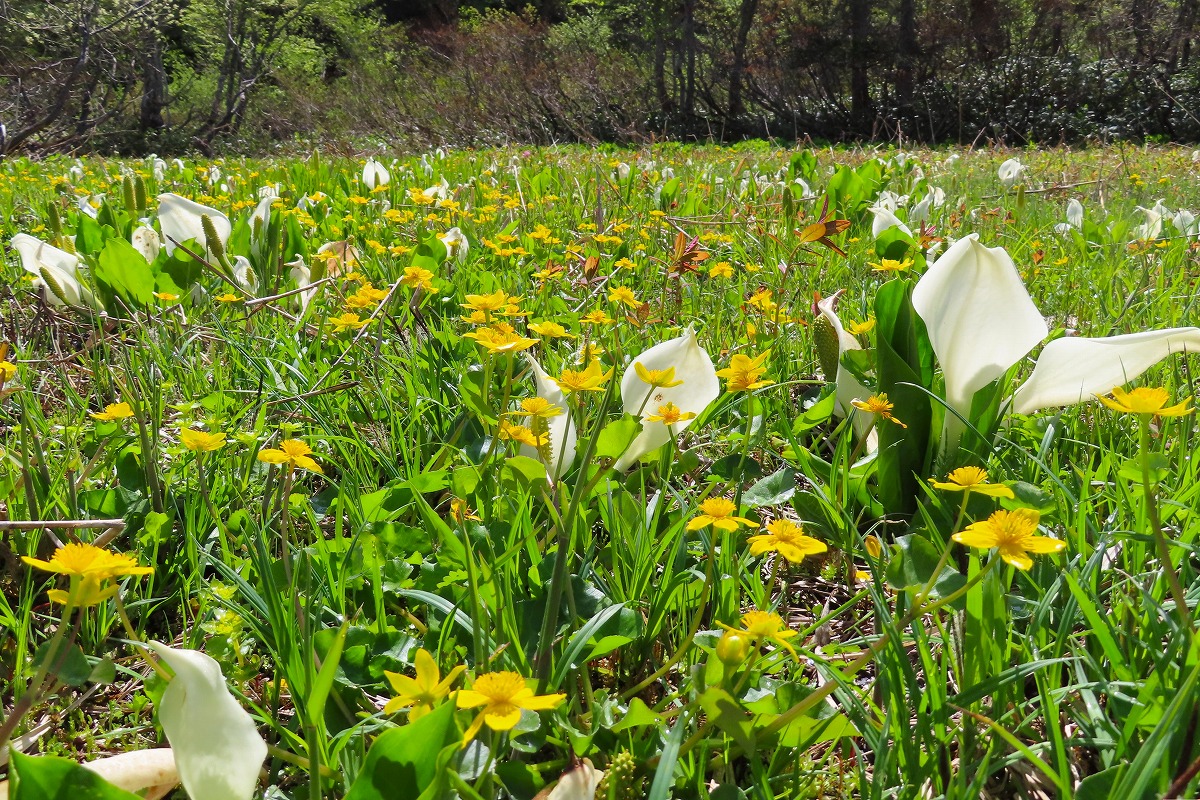 東電小屋~東電尾瀬橋にかけての湿原には、ミズバショウとリュウキンカのお花畑が見られました。