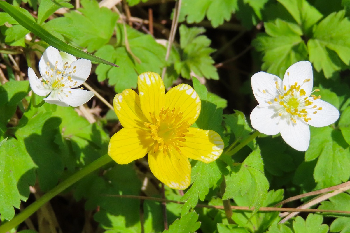 穏やかな日差しの下、白と黄色の絨毯が広がっています。