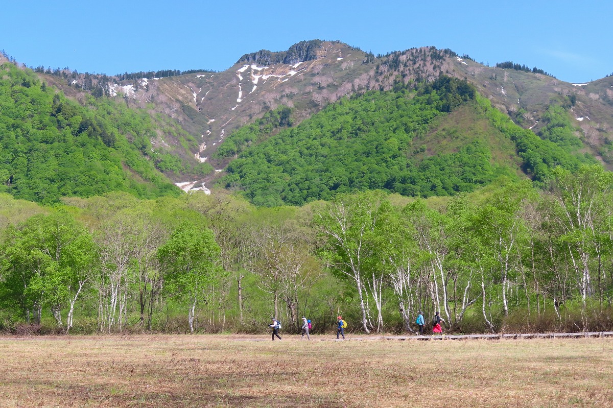 澄み渡る青空の下、たくさんのハイカーさんが尾瀬ヶ原を散策していました。