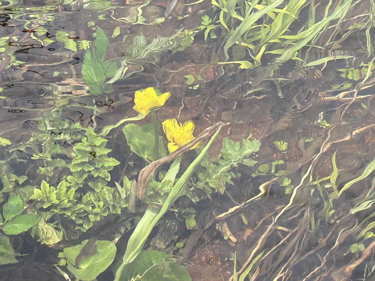尾瀬沼に注ぐ沢も増水し、リュウキンカが水中花になっていました。
