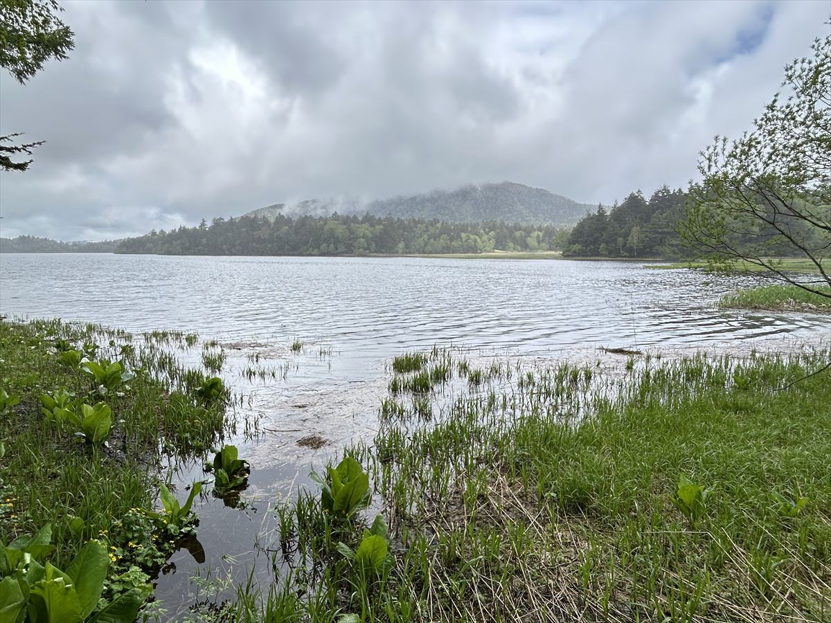 昨日の雨で、尾瀬沼はなみなみと水を湛えています。正面に見えるはずの燧ヶ岳は雲の中です。