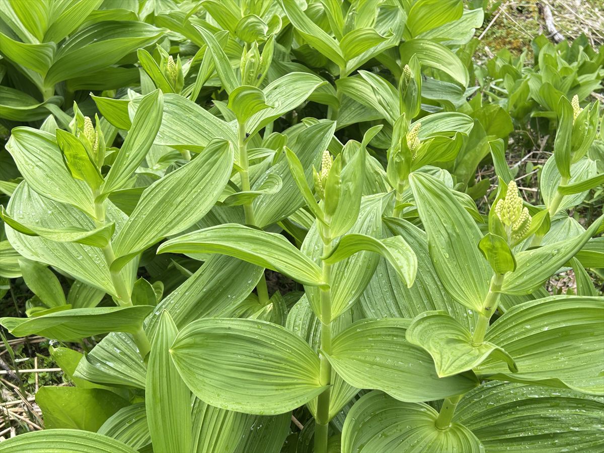 釜ッ堀湿原のコバイケイソウが開花してきました。昨年はほとんど花をつけていませんでしたが、今年は釜ッ堀湿原と大江湿原でもたくさんつぼみをつけており群生を楽しんでいただけそうです。