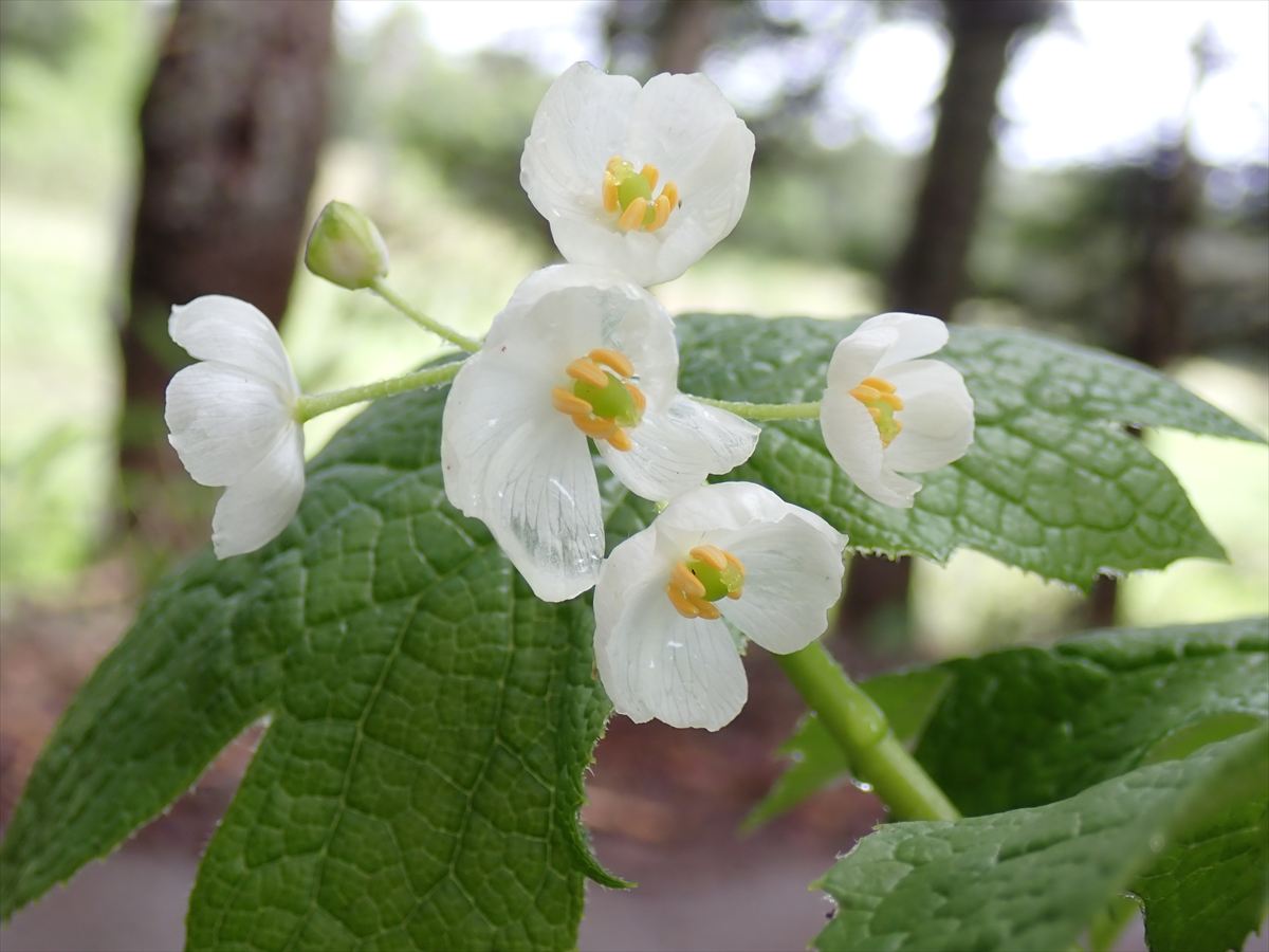 ビジターセンター付近のサンカヨウは雨に濡れて、花びらが少し透明になっている株がありました。昨日の雨で花が散ってしまった株もあります。