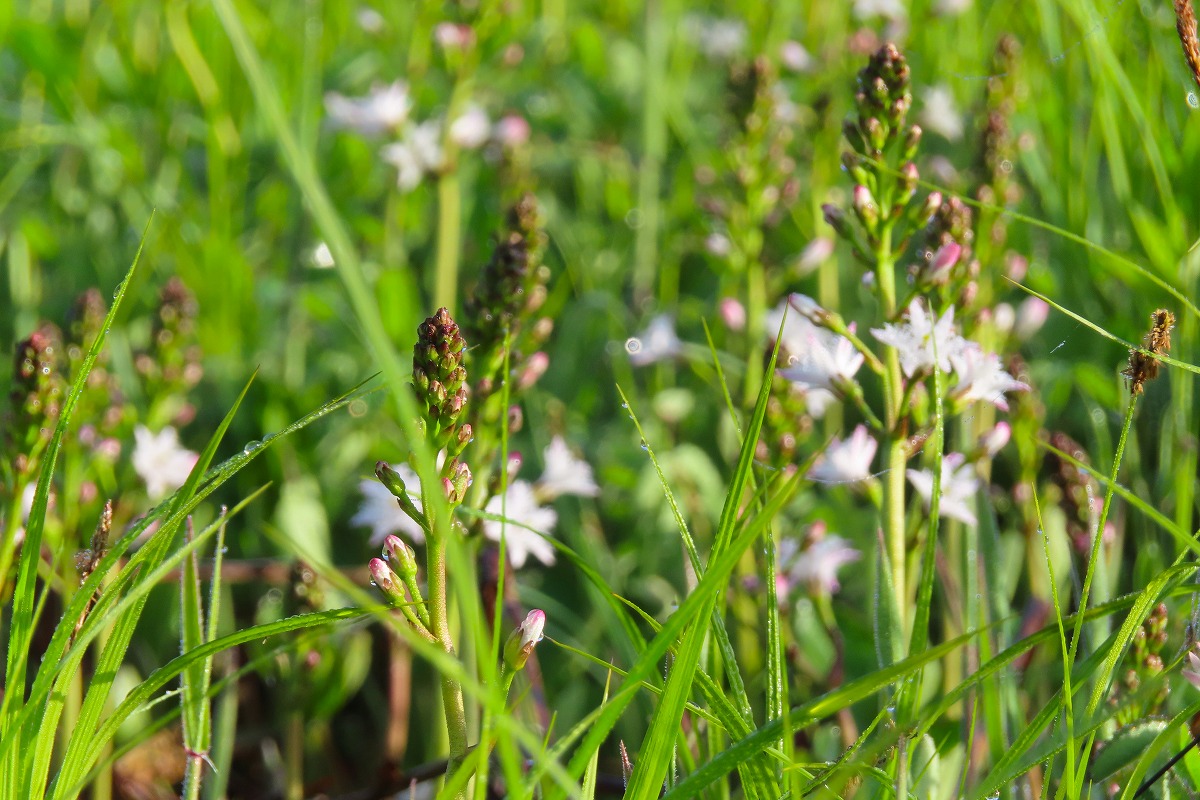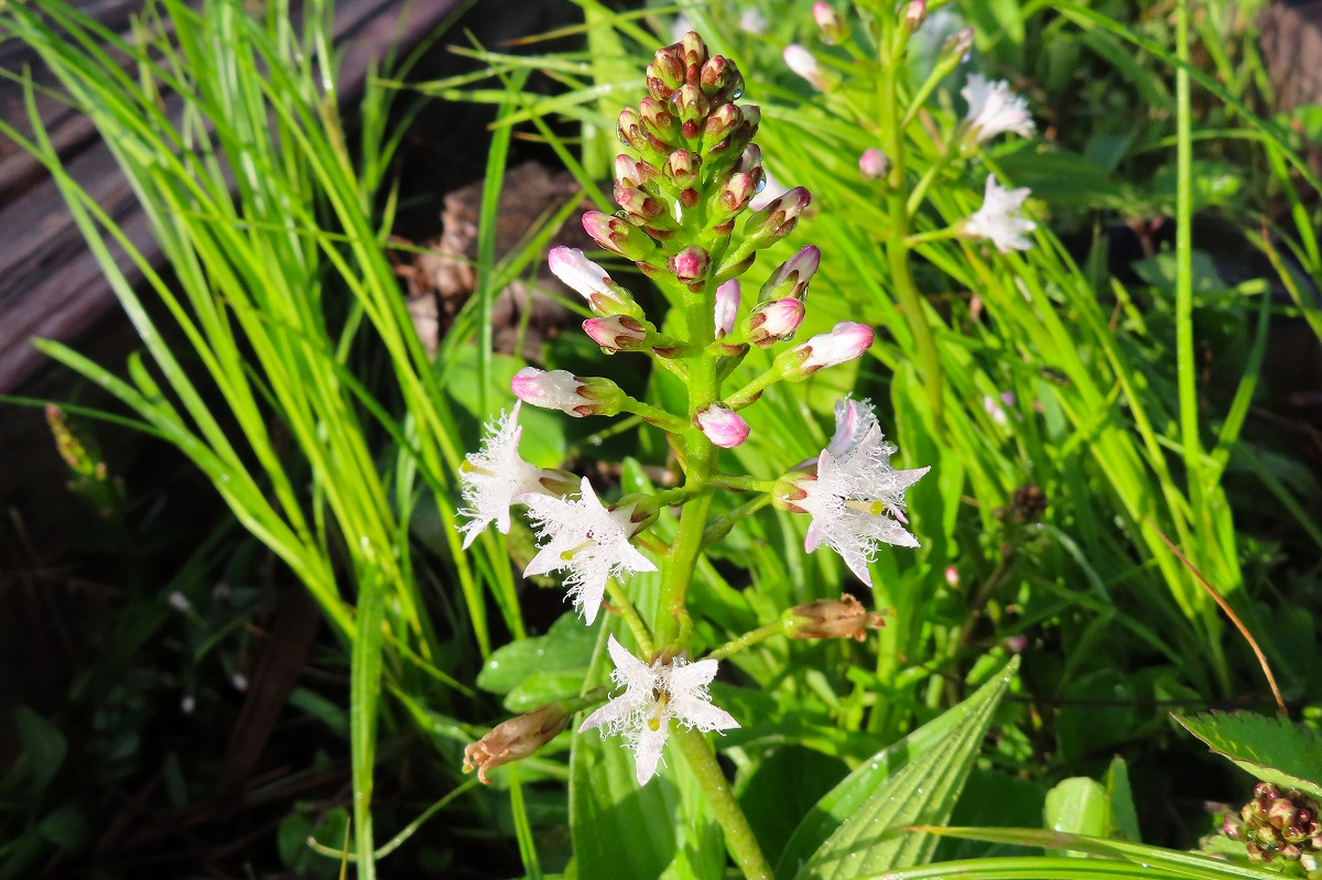 研究見本園中通りでは、白いお星さまのようなミツガシワの花が次々と顔を出し始めました。