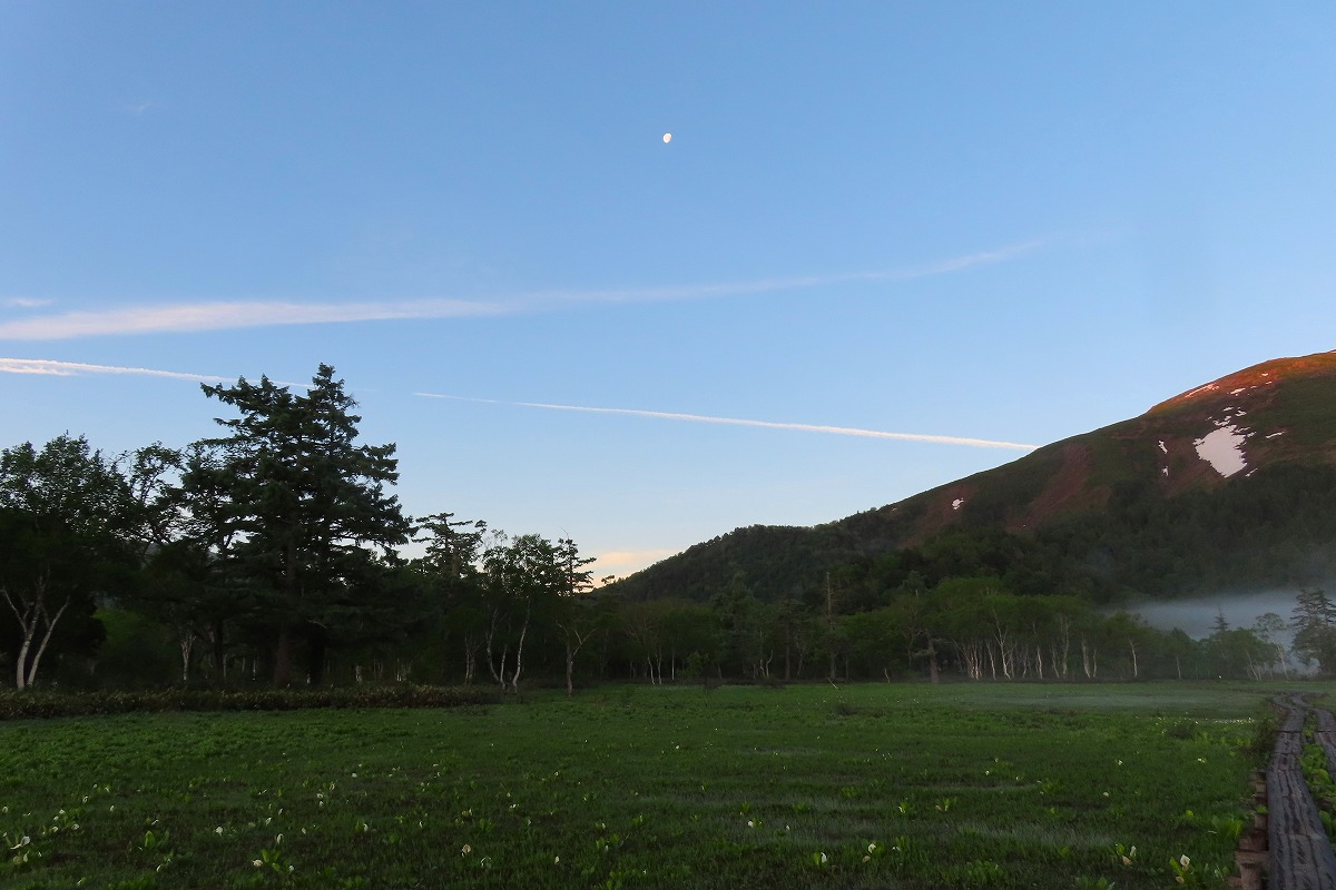 夜明け前の静けさの中、空を見上げると至仏山の西側にお月様が昇っていました。