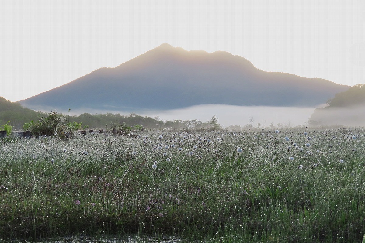燧ヶ岳より朝日が昇り、ワタスゲの群生が輝きだしました。
