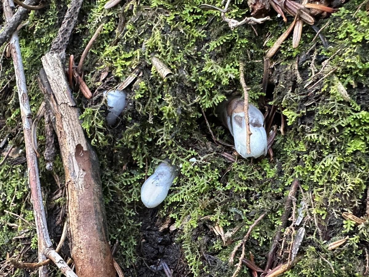 沼山峠展望台付近の林床に、白くて丸い物体がポツポツと現れました。何かの卵?いいえ、これはギンリョウソウの芽です。もうじきその名前の由来となった白銀色の竜のような花が現れることでしょう。