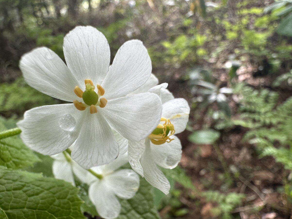 尾瀬沼ビジターセンター周辺でみられるサンカヨウの花も残りわずかとなりました。すりガラスのような花びらで朝露を受けています。