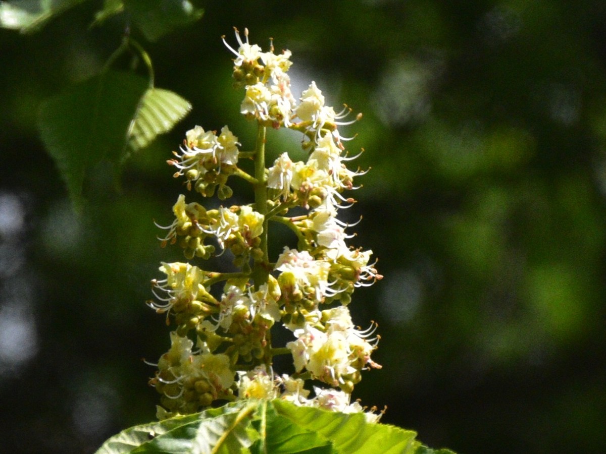 トチノキの花は、咲き始めの三日間は花の中心部に黄色い模様(蜜標)を持ち、蜜をたくさん分泌します。四日目以降になると、この蜜標は赤く変わり、蜜の分泌も止まるという、少し変わった特徴があります。