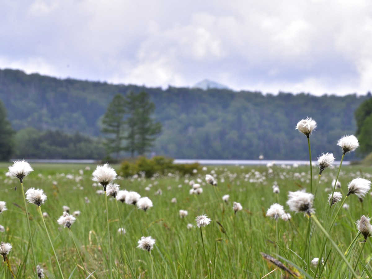 大江湿原ではワタスゲの果穂が目立つようになりました。緑の湿原にゆらゆらと揺れる白いワタスゲ。夏の訪れを予見させてくれます。