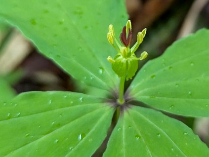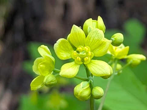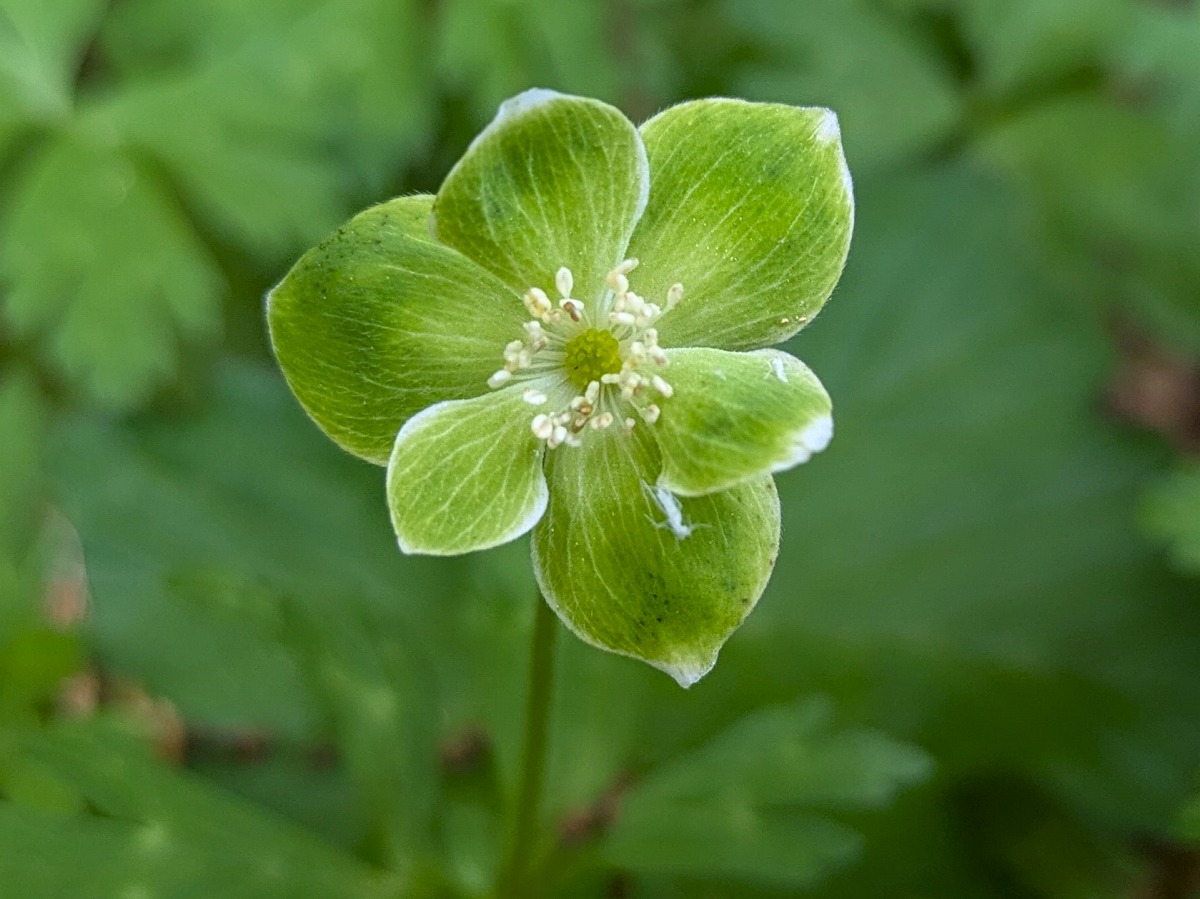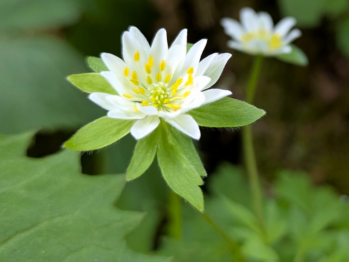 登山口を入ると、朝露をまとったサンカヨウの花弁がガラス細工のようになっていました。ノビネチドリも出迎えてくれています。