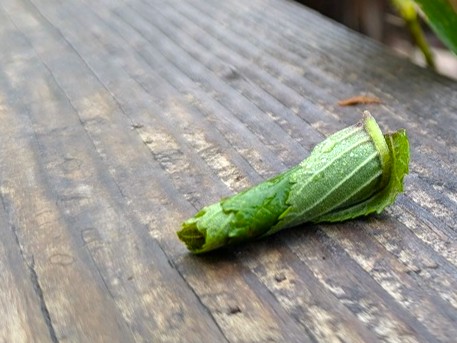 テンマ沢を渡り終えた木道上に丸まった葉っぱが落ちていました。だれの仕業でしょう。実は、オトシブミという昆虫が葉の中に卵を入れて丸めたものです。幼虫を守るゆりかごですね。