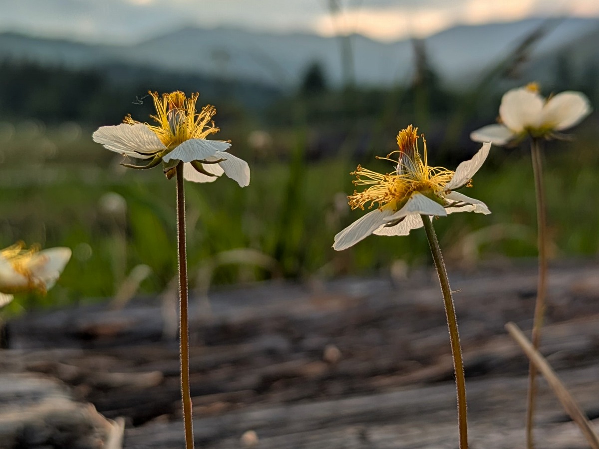 昨日の夕方は、夕日が池塘に映り、果穂になり始めたワタスゲやチングルマが夕日を受けて輝いていました。