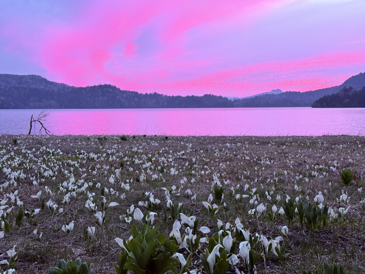 この日の釜ッ堀湿原は太陽が沈んだあとに不思議な色に染まりました。言葉では表現できない色合いでした。大江湿原では尾瀬のお花のバトンリレーの次の走者が見られました。