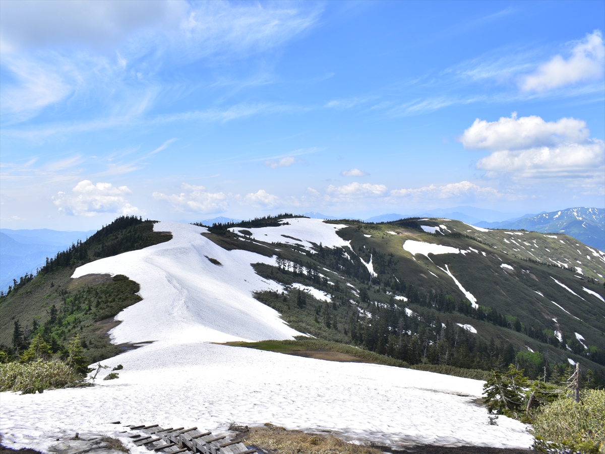 会津駒ヶ岳山頂付近には残雪が見られますが、基本的にはストックのみで登頂可能です。アイゼンを着用される場合は以下の2点にお気をつけ下さい。①日中の雪は非常に柔らかく、アイゼンの裏に雪が付着しやすくなります。雪の重みで歩きにくくなったり、アイゼンの底の雪と地面の雪とが接触すると、かえって滑りやすくなる可能性がありますので、ご注意ください。②木道の上ではアイゼンを外しましょう。木道上に穴が空き、木道の劣化が進みます。また、滑り止めの金網にアイゼンの歯がひっかかると転倒の恐れがあります。