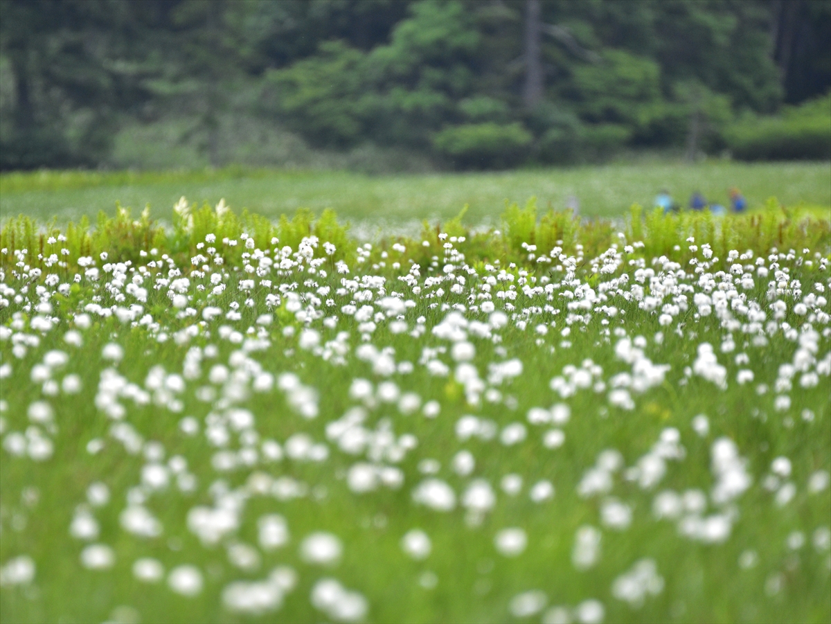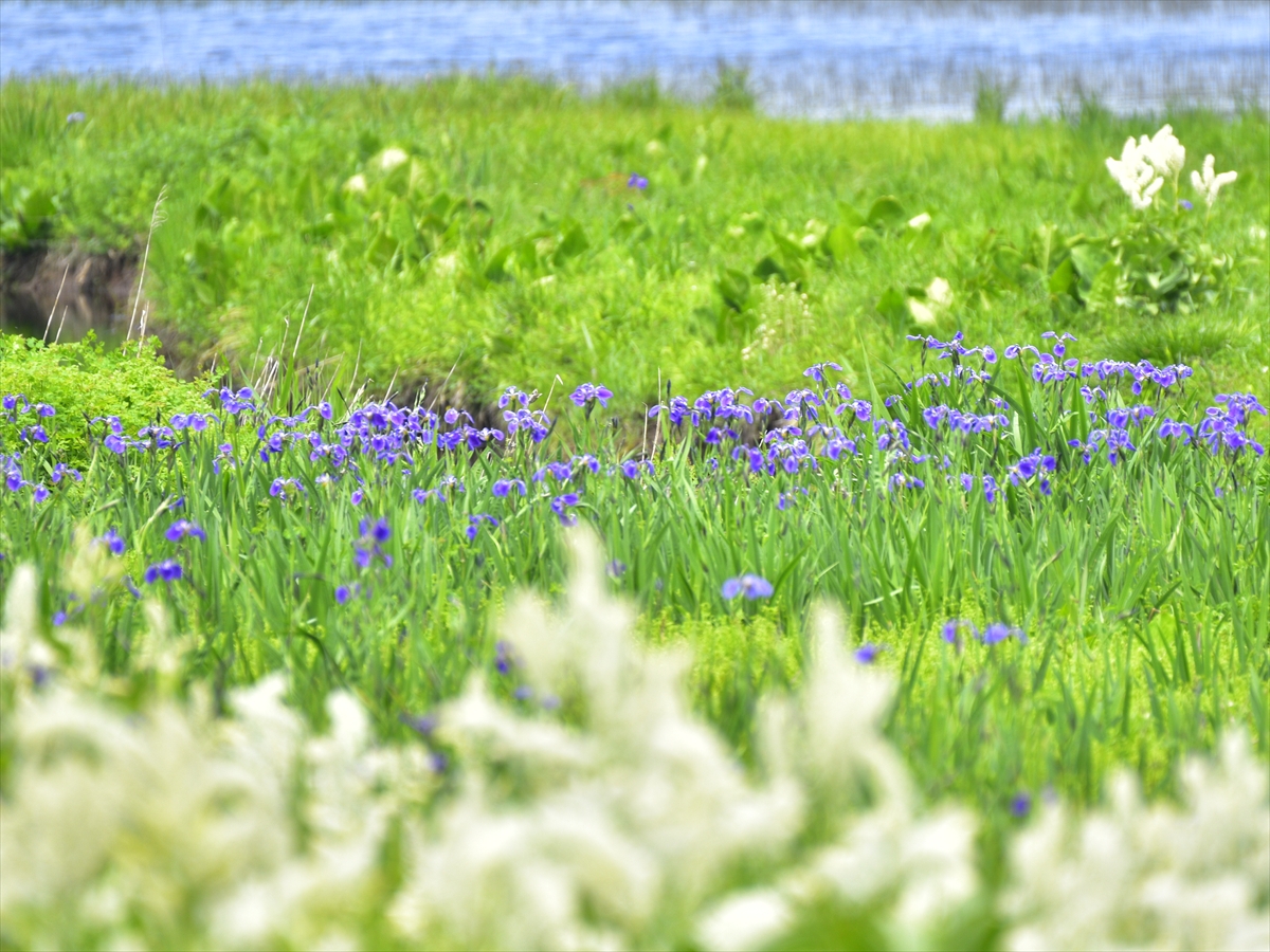 大江湿原を見渡すと、あるところからは一面のワタスゲ、またあるところからは一面のコバイケイソウ、そしてヒオウギアヤメ。見る角度や歩く場所によって、次々と花々の世界が広がります。