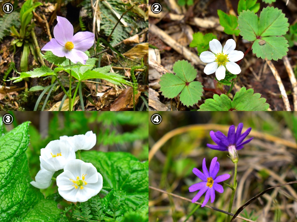 ①水場周辺の斜面ではシラネアオイがあちらこちらで見られます。水場の雪はすっかり融けて、冷たい清水を堪能することができます。水場は登山道中腹のベンチがある広場から少し下った場所になります。少しだけ急な道になりますので、足元に気をつけてご通行ください。②駒の小屋が近づくとノウゴウイチゴの群生が見られます。他にも、ムラサキヤシオやオオカメノキ、ショウジョウバカマなど尾瀬沼周辺で少し前に咲いていた花が多く見られました。マイヅルソウのつぼみもたくさん見られ、これからが楽しみです。③サンカヨウは山頂直下西側にある山頂を迂回する登山道で見られました。④中門岳では一株だけ、いち早く咲いたハクサンコザクラを見ることができました。例年の見頃は7月中下旬頃となります。今年もたくさんのハクサンコザクラの群生が見られると良いですね。