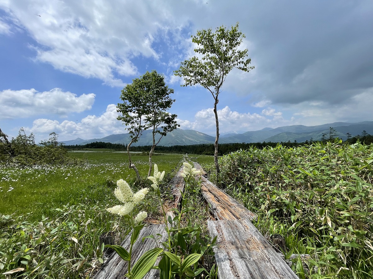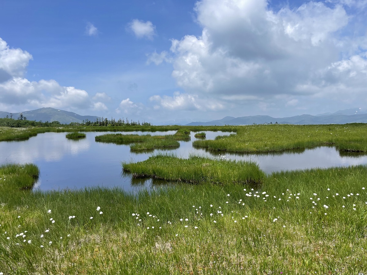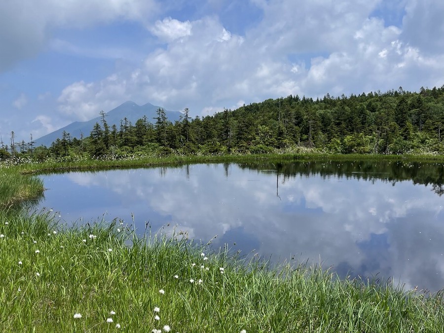 バックに燧ヶ岳、そして青空が映る池塘の周りをワタスゲが囲む風景。手前のベンチに座って、時間を忘れてずっと眺めていたい風景です。