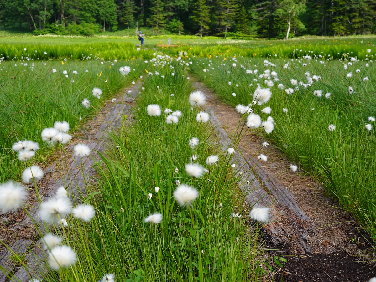 ワタスゲは見頃を迎えています。湿原に揺蕩う白い綿毛に、ニッコウキスゲの鮮やかなオレンジ色の彩りが加わり、大江湿原はもうじき盛夏を迎えます。