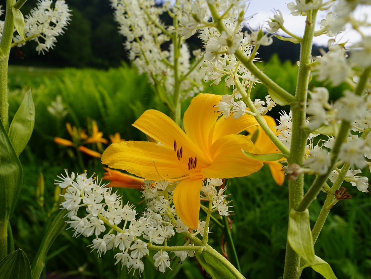 コバイケイソウは実を付けるものが増え、花のピークは過ぎつつあります。鮮やかなビタミンカラーのニッコウキスゲと白く可憐な小花をつけるコバイケイソウが寄り添って咲き、まるで花束のようです。