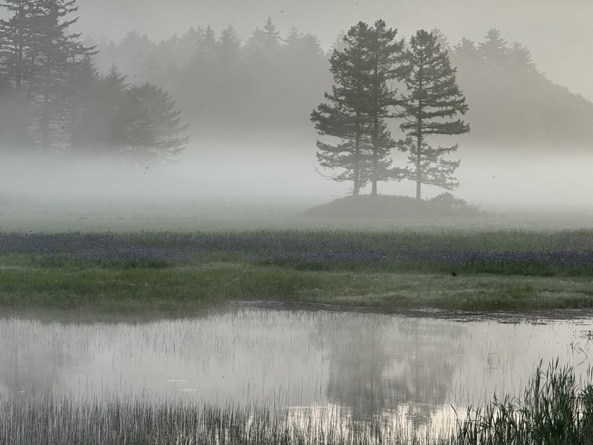 朝霧が立ちこめる中、ヒオウギアヤメの大群生に彩られた三本カラマツが尾瀬沼に写っていました。逆さ三本カラマツと呼べるにはもう少しかな~(笑)。