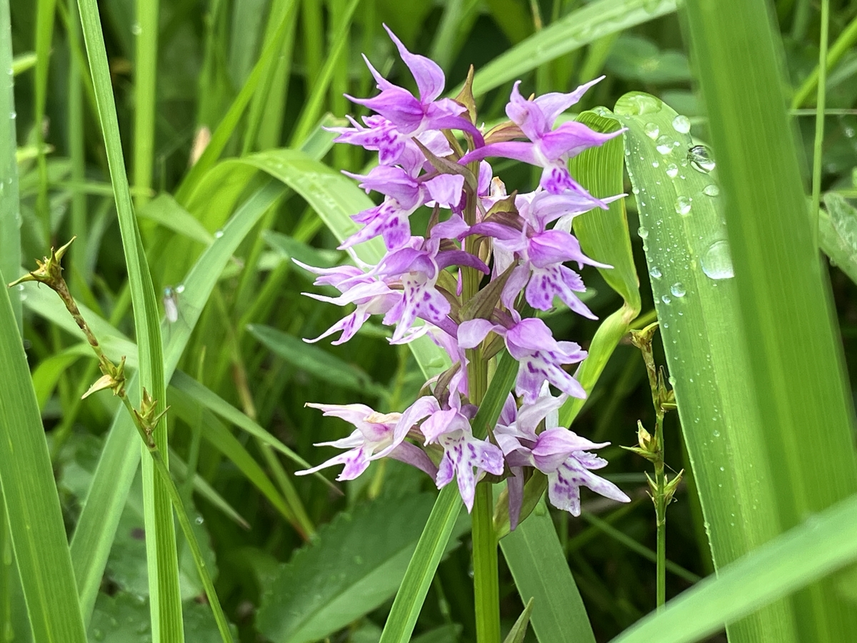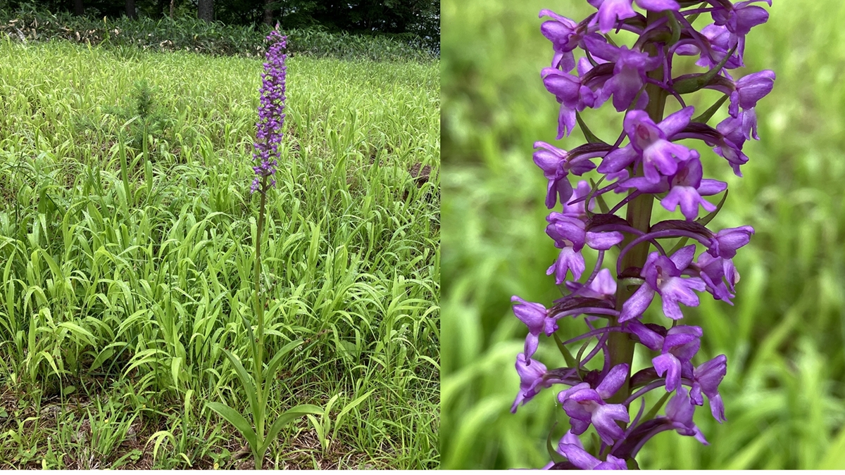 テガタチドリは、花びらの先が丸く、色は濃い赤紫です。花びらの内側に模様はありません。根が手の形をしているから付いた名前ですが、残念ながら確かめることができません。長蔵小屋休憩所の入口から見て、歩道を挟んだ向かい側に1株だけ咲いています。