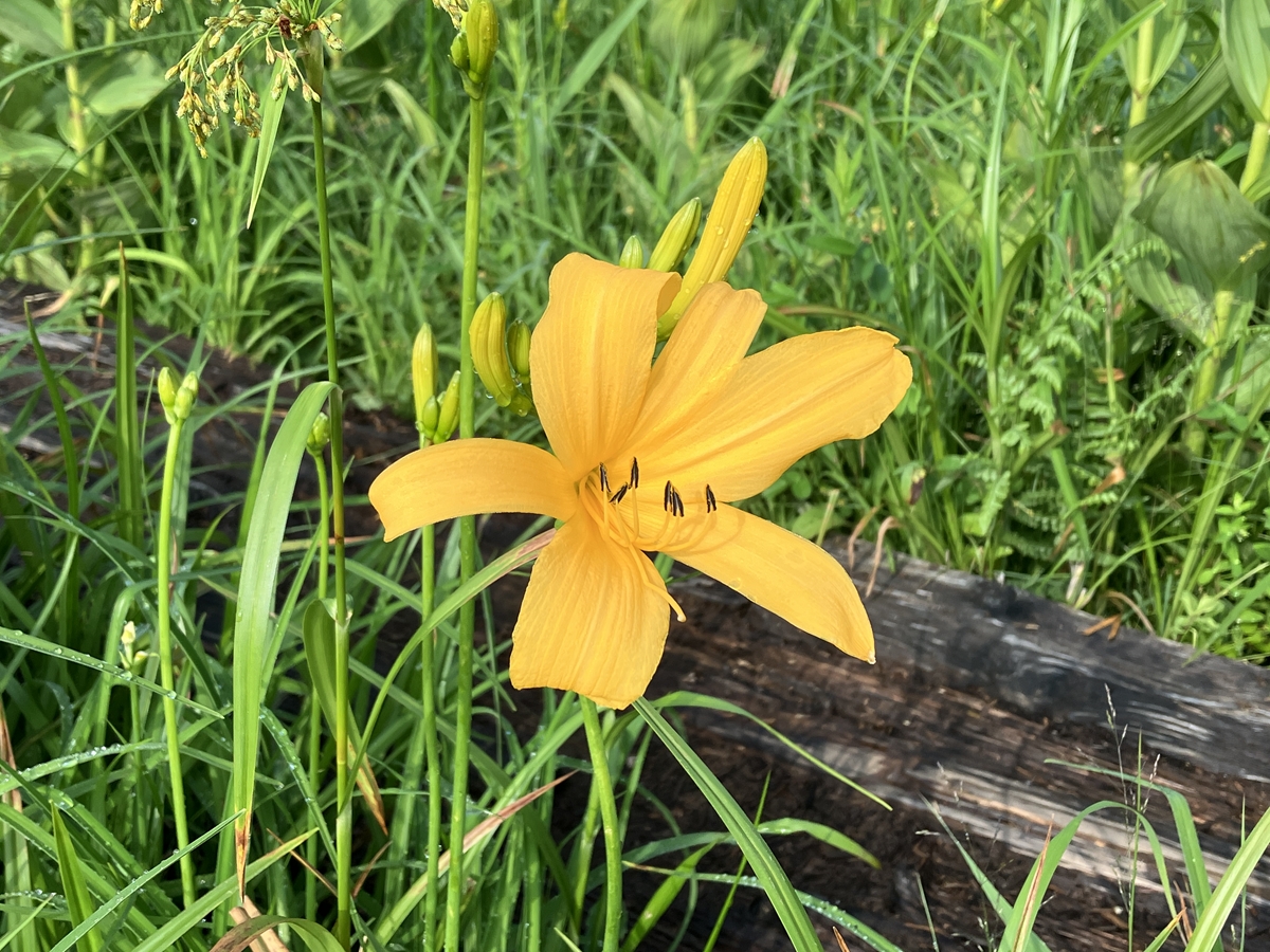 さて、昨日の夕方は雷が鳴り、雨もたくさん降りました。「ワタスゲの果穂も濡れてしまっただろう」と思いながら湿原を見に行くと、濡れたワタスゲは目立たずニッコウキスゲのつぼみが伸びて、「こんなにつぼみがあったかな」と思うほど、黄色が目立っていました。